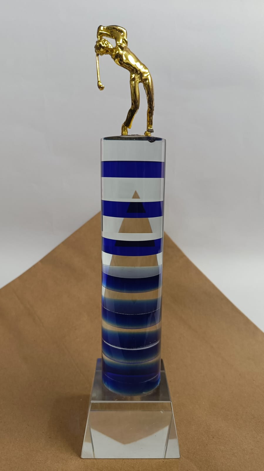 Command attention with this eye-catching golf trophy, featuring a sleek blue-striped crystal column topped with a brilliant golden golfer in mid-swing. Perfect for recognizing excellence on the green, this trophy blends modern style with classic prestige.