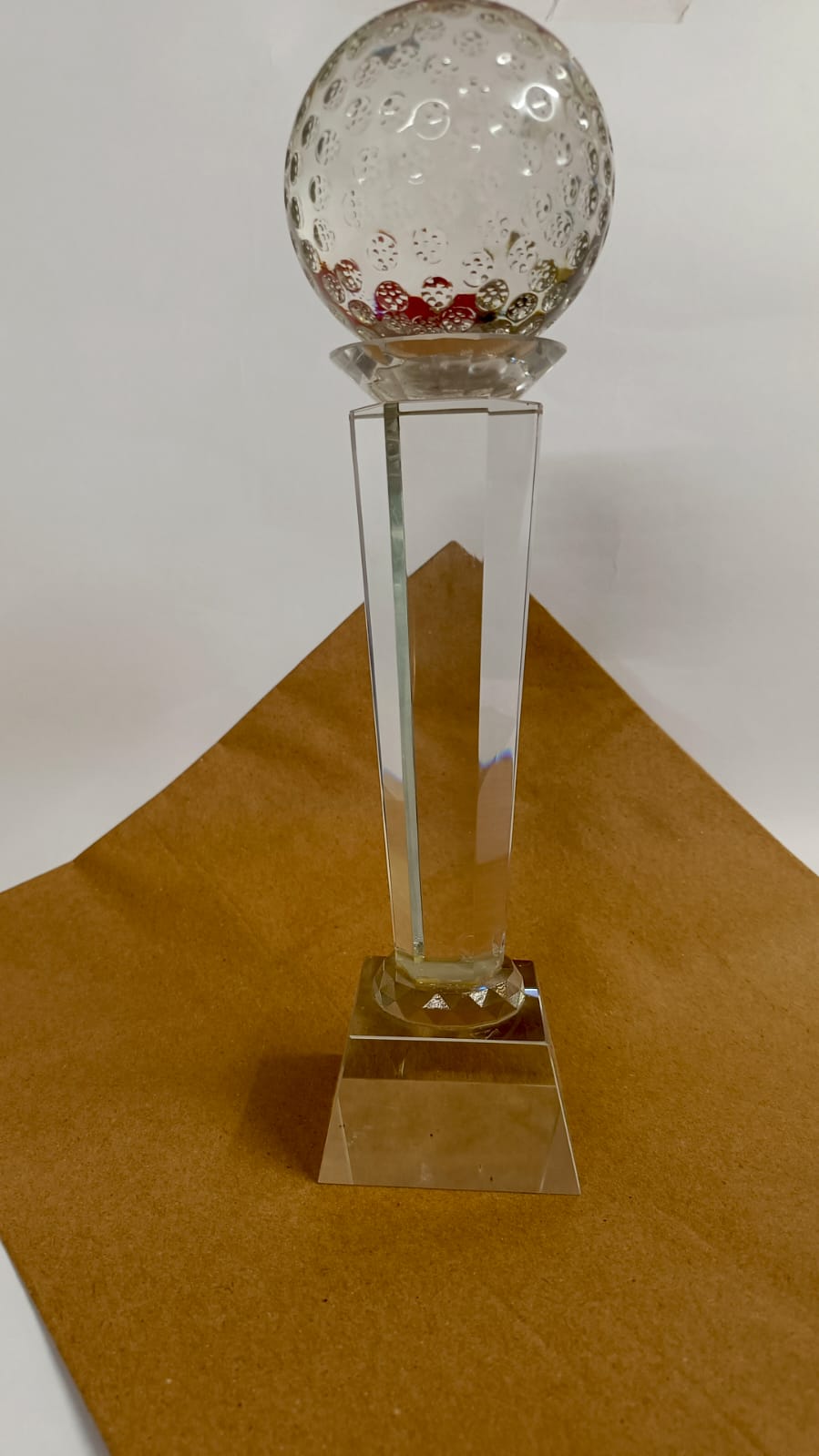 Elevate your next golf event with this stunning Crystal Golf Trophy, crafted for elegance and prestige. Featuring a dimpled glass golf ball perched atop a tall, clear crystal pedestal, this trophy makes a bold statement of excellence, achievement, and class.