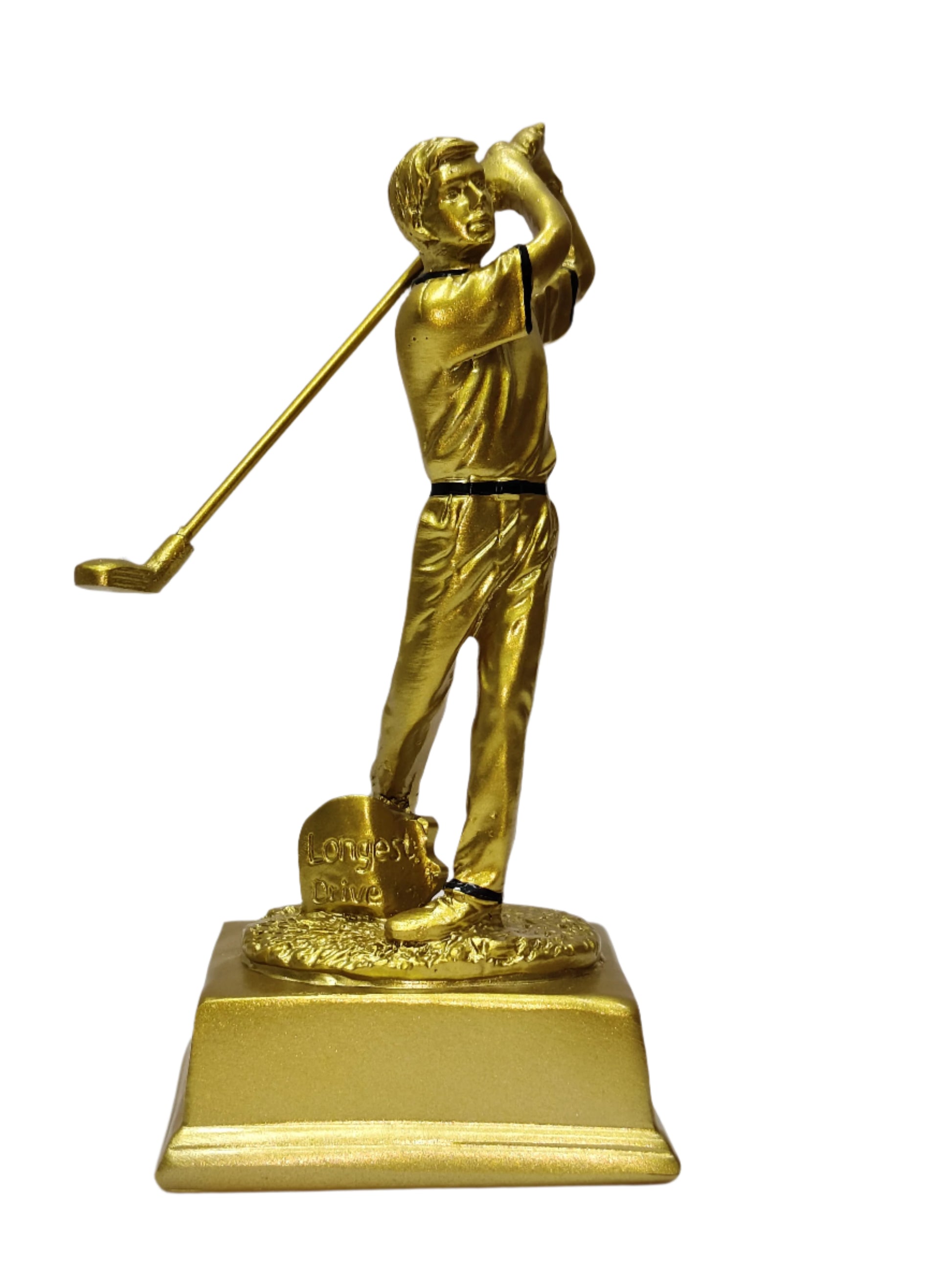 Honor the most powerful swing on the course with this striking Longest Drive Trophy, designed for golfers who bring both strength and style to the game. Featuring a detailed male golfer mid-swing, this antique-finish figurine stands tall on a sleek black base—making it a standout award for any golf tournament or event.